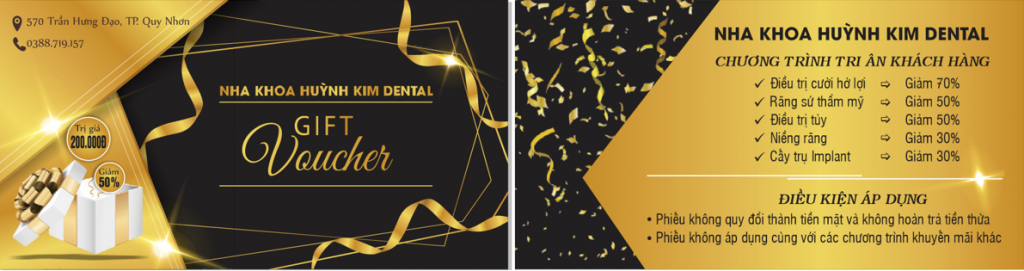Với thẻ khách hàng: Member card, Happy Card, Boss Card, Khách hàng sẽ được hưởng các ưu đãi cho lần điều trị tiếp theo, nghĩa là khi bạn đã là Khách hàng của Nha Khoa Huỳnh Kim Dental, bạn luôn được chăm sóc lâu dài. Với người thân của Khách hàng cũng có những ưu đãi nhất định khi cầm theo thẻ của khách hàng cũ của Nha Khoa Huỳnh Kim Dental.
